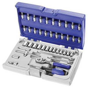 Doppen 1/4 6-kant : 4-4,5-5-5,5-6-7-8-9-10-11-12-13-14 mm Schroevendraaierdoppen Pozidriv® 1/4 : PZ1-PZ2-PZ3 Schroevendraaierdoppen Philips® 1/4 : PH1-PH2-PH3 6-kant schroevendraaierdoppen 1/4 : 3-4-5-6-7-8 mm Schroevendraaierdoppen Torx® 1/4 : T10-T15-T20-T25-T30-T40 Sleufschroevendraaierdoppen 1/4: 4-5,5-7 mm 3 verlengstukken 1/4 : 55-100-150 mm 1 T handvat 1/4. 1 handvat voor schroevendraaier van bimateriaal 1 universeel cardangewricht 1/4 1 ratel met parkeermeter-kop 1/4 met vergrendeling 1 dophouderbit 1/4 1 universele ratel 1/4
