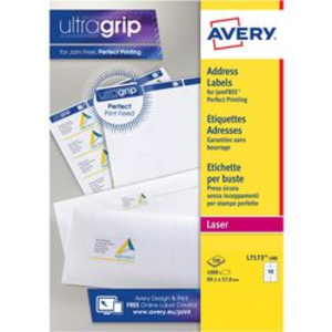 Avery verzendetiketten voor laserprinters Quickpeel L7173-100. Deze etiketten zijn milieuvriendelijk, volledig recycleerbaar en voorzien van lijm op waterbasis. Tevens beschikken deze etiketten over perfecte doorloopeigenschappen. Afmetingen (L x B): 99,1 x 57,0 mm. Kleur: wit. Pak: 10 x 100 vel.