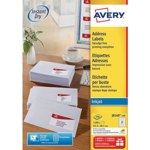 Witte adreslabels Avery, Aantal etiketten/vel: 21, Aantal etiketten: 2100, Lengte etiket: 63.5 mm, Breedte etiket: 38.1 mm, Type nr.: J8160, Kleur: Wit, Type: Permanent klevend, Afdruk: Inkjet, Recyclebare verpakking: Ja - 100%, Gerecyclede verpakkingen: 90 %, Gerecycled product: 30 %, Eco-verantwoordelijke aanpak: ja, FSC licentie: ja