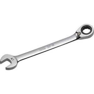 Ratelsleutel combinatie met STOP systeem in mm. Glanzende gepolijste afwerking. Het vereenvoudigt het bewerken van moeren op draadstangen. Sleutel onder een hoek van 15° voor de doorgang van de hand. Gewicht 70 g.