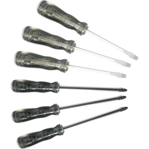 Set 6 schroevendraaiers van acetaat, met bolkop om te kunnen kloppen als het losdraaien moeilijk gaat. Samenstelling: 3 Sleuf: 4x100 - 6,5x150 - 8x175 3 Pozidriv®: 1x100 - 2x100 - 3x100