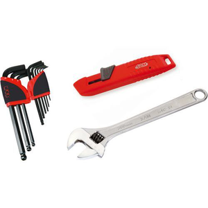 Inbussleutelset in mm rek van 9 - Cutter - Moersleutel 10 inch. Set van 3 stuks gereedschap geleverd in een doos. 1 set van 9 inbussleutels met sferische kop. 1 zelfinschuifbaar cutter. 1 kraagschroefsleutel 10 inch.