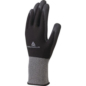 Polyester/Spandex. Coating in nitril op palm en vingertoppen. Noppen in nitril op de palm. Jauge 15.