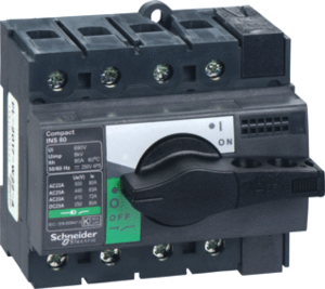 Schneider Electric Interpact INS lastscheider, apparaatbouwvorm inbouwapparaat vaste inb., uitvoering als hoofdschakelaar, uitvoering als werkschakelaar, vergrendelbaar, nom. continustroom Iu 80A, 4 polen, beschermingsgraad frontzijde (IP) IP40, bedieningselement zwart, geschikt voor verdelerinbouw,