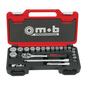 17 doppen: 8/10/11/12/13/14/15/16/17/18/19/21/22/24/27/30/32 mm. 1 peerratel // 1 kruiskoppeling //2 verlengstukken: 125 en 250 mm.
