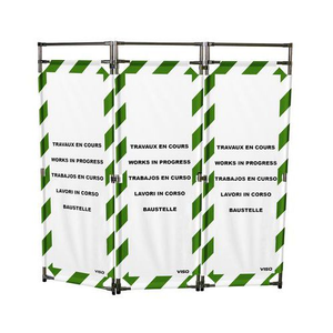 Ideale werkafzetting voor de afscheiding van een zone of doorgang. Licht en zeer stabiel dankzij de 3 delen. Kan eenvoudig worden geïnstalleerd en verplaatst. Rvs-constructie en polyester panelen. De afzetting is naar wens aanpasbaar met uitbreidingen, bases en een transportzak. De stoffen worden bevestigd met klittenband en geleverd met de verbindingen.