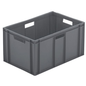 In polyethyleen met hoge dichtheid. Kleur grijs. De Euronorm-bakken zijn verkrijgbaar in het formaat (buitenkant) 600 x 400 mm of 400 x 300 mm. Ze zijn geschikt voor de opslag op pallets in het formaat 1200 x 800 mm en voor het hanteren op de transportwagens met wielen code 140523.