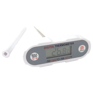Voor de controle van de T° van voedingsmiddelen bij de ontvangst of tijdens opslag. IP65, water- en stofdicht. Precisie ± 1 °C, van 0° tot +100 °C, daarna ± 2 °C. Sonde van roestvrij staal. Gewicht 74 g. IP 65