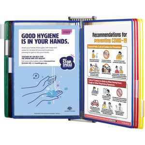 Wandsysteem antimicrobiële A4 - 10 zichtpanelen. Geef documenten weer en beperk de microbiële groei. Metalen wandgemonteerd documentendisplaysysteem met zijstoppen en 10 antimicrobiële A4 draaivakken. De zakken zijn voorzien van originele, exclusieve Tarifold-draadtechnologie van staal. Systeem is oneindig uitbreidbaar en past zich gemakkelijk aan het volume van uw documenten aan