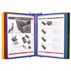 Wandsysteem Easy load A4 - 10 zichtpanelen - PP. Het ultieme eco-verantwoorde presentatiesysteem: 100% recyclebare zakken! Presenteer, organiseer en bescherm uw belangrijke documenten in een oogwenk. Aan de muur gemonteerd metalen documentpresentatiesysteem met zijstoppers en 10 draaibare A4-vakken. Koffers en zakframes zijn 100% PP. Easy Load-opening: brede hoekopening voor het snel en eenvoudig invoegen van documenten
