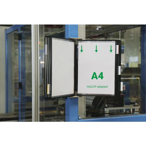 Wandsysteem Tarifold rvs A4, 10 zichtpanelen zijkant. Drie redenen om een RVS wanddocumentpresentatiesysteem te gebruiken: onberispelijke hygiëne, een vrij werkblad, beschermde en afwasbare documenten. Goed effectief!Menu's, recepten, instructies, technische informatie...uw documenten zijn toegankelijk en beschermd in deze vochtbestendige zakken. Speciaal ontworpen voor omgevingen die onderworpen zijn aan HACCP-hygiënenormen (keukens, restaurants, slaapkamers koud…). Roestvrijstalen metalen elementen om roestvorming te voorkomen