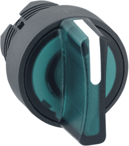 Schneider Electric Harmony XB5 keuzeschakelaar frontelement, uitvoering van het bedieningselemen korte draaigreep, geschikt voor verlichting, schakelfunctie vergrendelend, frontrand zwart, bedieningselement groen, 3 schakelstanden, gatdiameter 22.5mm, bouwvorm lens rond, signaallampkapje groen,