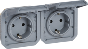 Legrand Plexo wandcontactdoos (wcd schakelmat.), grijs, uitvoering contactdoos CEE 7/3 (type, aardcontact overig, 2 eenheden, 1 fasen, opdruk/indicatie beschermingsgraad (IP), aansluitwijze steekklem, met klapdeksel, met verhoogde aanraakbeveiliging, RAL-nummer 7046