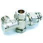 Comap tweepunts onderaansluitblok, messing, maat radiatoraansluiting 1/2" (15), maat leidingaansluiting M22, aansluitrichting leidingen naar wand, aanvoer radiatorzijdig, geschikt voor tweepijpssysteem, oppervlaktebescherming vernikkeld, afsluitbaar, instelbaar, kvs-waarde 1.725,