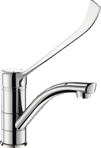 Delabie wastafelmengkraan (opbouw), messing, uitvoering mechanisch, 1-gats kraangaten, uitvoering uitloop draaibaar onder, kraanmondstuk overig, oppervlaktebescherming verchroomd, kraan messing, oppervlaktebehandeling gepolijst, type uitloop gegoten, accentkleur chroom, temperatuurbegrenzing,