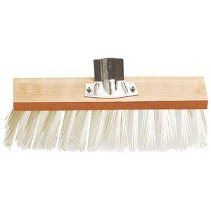 Voor het vegen van ruwe en harde oppervlakken, moeilijke vloeren (kleigrond, goten, etc.). Robuuste en harde borstel in rode synthetische vezels (crynovil), bestand tegen vocht. Houten frame, met gelakte stalen sokkel, geschroefd, met terugslagnokken op het handvat, diameter 28 mm.