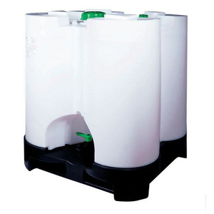 Transportcontainer voor gevaarlijke producten UN-ADR herbruikbaar. Container van wit polyethyleen op pallet met 6 sleden zwart polyethyleen. Aftapkraan met dop DN150 en ontluchtingsklep, afdichtingen van het type Viton. Belangrijk, container met afdichtingen type Viton: - Goede bestendigheid tegen opzwellen: alifatische koolwaterstoffen (propaan, butaan, benzine, minerale oliën, smeermiddelen, hydraulische (H, H-B en H-LP)) en vettige vloeistoffen op basis van minerale olie, moeilijk ontvlambare hydraulische vloeistoffen (groepen HFA, HFB en HFC), plantaardige en dierlijke oliën en vetten, lichte brandstoffen en diesel. - Gemiddelde bestendigheid tegen opzwellen: brandstoffen met verhoogde aromatische inhoud (superbenzine). - Sterke opzwelling: aromatische en chloorhoudende koolwaterstoffen (Benzol, trichlorethyleen), hydraulische vloeistoffen uit de groep HFD, esters, oplosmiddelen, remvloeistoffen op basis van glycol (ATE, pentosin). - Gebruikstemperatuur min./max.: -30 °C / +100 °C