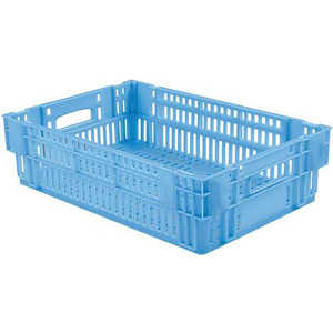 Krat geperforeerd stapelbaar en nestbaar 27, Totale inhoud: 27 L, Totale hoogte: 146 mm, Totale breedte: 400 mm, Totale lengte: 600 mm, Type bodem: Geperforeerd, Type zijkant: Geperforeerd, Kleur: Blauw, Materiaal: Polyethyleen van hoge dichtheid, Model: Krat, Nestbaar: ja, Nuttige breedte: 355 mm, Gewicht: 1.55 kg, Nuttige hoogte: 135 mm, Nuttige lengte: 555 mm