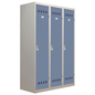 Garderobekast zware industrie, Type garderobekast: Met vakken en garderobe, Materiaal: Staal, Aantal kastkolommen: 3, Onderstel: Op sokkel, Type sluiting: Met hangslot, Hoogte: 1800 mm, Breedte: 1200 mm, Breedte kolom: 400 mm, Diepte: 500 mm, Plaatstaal dikte: 7/10de, Nuttige hoogte vak: 1685 mm, Nuttige breedte vak: 399 mm, Nuttige diepte vak: 473 mm, Kleur ombouw: Lichtgrijs, Kleur deur: Lichtblauw, Geleverd gemonteerd: ja, Garderobekast gebruiksomgeving: Zware industrie, Gerecyclede verpakkingen: 95 %, Gerecycled product: 52 %, Eco-verantwoordelijke aanpak: ja, Aantal vakken: 3, NF Milieu: nee, NF: nee