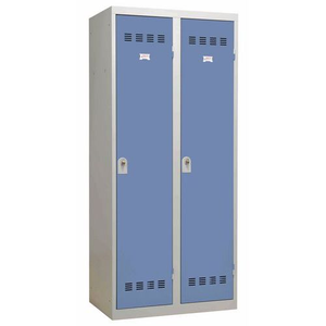 Garderobekast zware industrie, Type garderobekast: Met vakken en garderobe, Materiaal: Staal, Aantal kastkolommen: 2, Onderstel: Op sokkel, Type sluiting: Met hangslot, Hoogte: 1800 mm, Breedte: 800 mm, Breedte kolom: 400 mm, Diepte: 500 mm, Plaatstaal dikte: 7/10de, Nuttige hoogte vak: 1685 mm, Nuttige breedte vak: 399 mm, Nuttige diepte vak: 473 mm, Kleur ombouw: Lichtgrijs, Kleur deur: Lichtblauw, Geleverd gemonteerd: ja, Garderobekast gebruiksomgeving: Zware industrie, Gerecyclede verpakkingen: 95 %, Gerecycled product: 52 %, Eco-verantwoordelijke aanpak: ja, Aantal vakken: 3, NF Milieu: nee, NF: nee