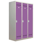 Garderobekast zware industrie, Type garderobekast: Met vakken en garderobe, Materiaal: Staal, Aantal kastkolommen: 3, Onderstel: Op sokkel, Type sluiting: Met sleutel, Hoogte: 1800 mm, Breedte: 1200 mm, Breedte kolom: 400 mm, Diepte: 500 mm, Plaatstaal dikte: 7/10de, Nuttige hoogte vak: 1685 mm, Nuttige breedte vak: 399 mm, Nuttige diepte vak: 473 mm, Kleur ombouw: Lichtgrijs, Kleur deur: Paars, Geleverd gemonteerd: ja, Garderobekast gebruiksomgeving: Zware industrie, Gerecyclede verpakkingen: 95 %, Gerecycled product: 52 %, Eco-verantwoordelijke aanpak: ja, Aantal vakken: 3, NF Milieu: nee, NF: nee