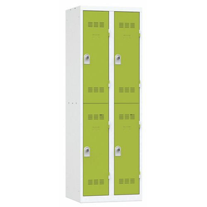 Meervaks garderobekast, Type garderobekast: Met vakken, Materiaal: Staal, Aantal vakken/kolom: 2, Aantal kastkolommen: 2, Onderstel: Op sokkel, Breedte kolom: 300 mm, Aantal kubusvakken: 4, Type sluiting: Met hangslot, Hoogte: 1800 mm, Breedte: 600 mm, Diepte: 500 mm, Plaatstaal dikte: 7/10de, Nuttige hoogte vak: 809 mm, Nuttige breedte vak: 298 mm, Nuttige diepte vak: 473 mm, Kleur ombouw: Lichtgrijs, Kleur deur: Anijs, Geleverd gemonteerd: ja, Gerecyclede verpakkingen: 95 %, Gerecycled product: 52 %, Eco-verantwoordelijke aanpak: ja, NF Milieu: nee, NF: nee