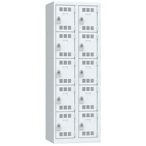 Meervaks garderobekast, Type garderobekast: Met vakken, Materiaal: Staal, Aantal vakken/kolom: 5, Aantal kastkolommen: 2, Onderstel: Op sokkel, Breedte kolom: 300 mm, Aantal kubusvakken: 10, Type sluiting: Met hangslot, Hoogte: 1800 mm, Breedte: 600 mm, Diepte: 500 mm, Plaatstaal dikte: 7/10de, Nuttige hoogte vak: 337 mm, Nuttige breedte vak: 298 mm, Nuttige diepte vak: 473 mm, Kleur ombouw: Lichtgrijs, Kleur deur: Lichtgrijs, Geleverd gemonteerd: ja, Gerecyclede verpakkingen: 95 %, Gerecycled product: 52 %, Eco-verantwoordelijke aanpak: ja, NF Milieu: nee, NF: nee