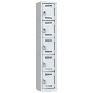 Meervaks garderobekast, Type garderobekast: Met vakken, Materiaal: Staal, Aantal vakken/kolom: 5, Aantal kastkolommen: 1, Onderstel: Op sokkel, Breedte kolom: 300 mm, Aantal kubusvakken: 5, Type sluiting: Met hangslot, Hoogte: 1800 mm, Breedte: 300 mm, Diepte: 500 mm, Plaatstaal dikte: 7/10de, Nuttige hoogte vak: 337 mm, Nuttige breedte vak: 298 mm, Nuttige diepte vak: 473 mm, Kleur ombouw: Lichtgrijs, Kleur deur: Lichtgrijs, Geleverd gemonteerd: ja, Gerecyclede verpakkingen: 95 %, Gerecycled product: 52 %, Eco-verantwoordelijke aanpak: ja, NF Milieu: nee, NF: nee