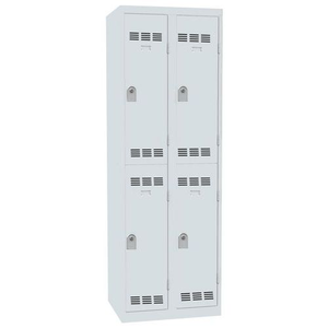 Meervaks garderobekast, Type garderobekast: Met vakken, Materiaal: Staal, Aantal vakken/kolom: 2, Aantal kastkolommen: 2, Onderstel: Op sokkel, Breedte kolom: 300 mm, Aantal kubusvakken: 4, Type sluiting: Met sleutel, Hoogte: 1800 mm, Breedte: 600 mm, Diepte: 500 mm, Plaatstaal dikte: 7/10de, Nuttige hoogte vak: 809 mm, Nuttige breedte vak: 298 mm, Nuttige diepte vak: 473 mm, Kleur ombouw: Lichtgrijs, Kleur deur: Lichtgrijs, Geleverd gemonteerd: ja, Gerecyclede verpakkingen: 95 %, Gerecycled product: 52 %, Eco-verantwoordelijke aanpak: ja, NF Milieu: nee, NF: nee