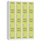 Meervaks garderobekast, Type garderobekast: Met vakken, Materiaal: Staal, Aantal vakken/kolom: 4, Aantal kastkolommen: 4, Onderstel: Op sokkel, Breedte kolom: 300 mm, Aantal kubusvakken: 16, Type sluiting: Met sleutel, Hoogte: 1800 mm, Breedte: 1200 mm, Diepte: 500 mm, Plaatstaal dikte: 7/10de, Nuttige hoogte vak: 422 mm, Nuttige breedte vak: 298 mm, Nuttige diepte vak: 473 mm, Kleur ombouw: Lichtgrijs, Kleur deur: Anijs, Geleverd gemonteerd: ja, Gerecyclede verpakkingen: 95 %, Gerecycled product: 52 %, Eco-verantwoordelijke aanpak: ja, NF Milieu: nee, NF: nee