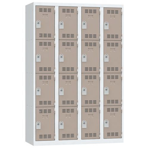 Meervaks garderobekast, Type garderobekast: Met vakken, Materiaal: Staal, Aantal vakken/kolom: 4, Aantal kastkolommen: 4, Onderstel: Op sokkel, Breedte kolom: 300 mm, Aantal kubusvakken: 16, Type sluiting: Met sleutel, Hoogte: 1800 mm, Breedte: 1200 mm, Diepte: 500 mm, Plaatstaal dikte: 7/10de, Nuttige hoogte vak: 422 mm, Nuttige breedte vak: 298 mm, Nuttige diepte vak: 473 mm, Kleur ombouw: Lichtgrijs, Kleur deur: Taupe, Geleverd gemonteerd: ja, Gerecyclede verpakkingen: 95 %, Gerecycled product: 52 %, Eco-verantwoordelijke aanpak: ja, NF Milieu: nee, NF: nee