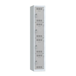 Meervaks garderobekast, Type garderobekast: Met vakken, Materiaal: Staal, Aantal vakken/kolom: 4, Aantal kastkolommen: 1, Onderstel: Op sokkel, Breedte kolom: 300 mm, Aantal kubusvakken: 4, Type sluiting: Met sleutel, Hoogte: 1800 mm, Breedte: 300 mm, Diepte: 500 mm, Plaatstaal dikte: 7/10de, Nuttige hoogte vak: 422 mm, Nuttige breedte vak: 298 mm, Nuttige diepte vak: 473 mm, Kleur ombouw: Lichtgrijs, Kleur deur: Lichtgrijs, Geleverd gemonteerd: ja, Gerecyclede verpakkingen: 95 %, Gerecycled product: 52 %, Eco-verantwoordelijke aanpak: ja, NF Milieu: nee, NF: nee