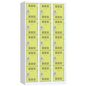 Meervaks garderobekast, Type garderobekast: Met vakken, Materiaal: Staal, Aantal vakken/kolom: 5, Aantal kastkolommen: 3, Onderstel: Op sokkel, Breedte kolom: 300 mm, Aantal kubusvakken: 15, Type sluiting: Met sleutel, Hoogte: 1800 mm, Breedte: 900 mm, Diepte: 500 mm, Plaatstaal dikte: 7/10de, Nuttige hoogte vak: 337 mm, Nuttige breedte vak: 298 mm, Nuttige diepte vak: 473 mm, Kleur ombouw: Lichtgrijs, Kleur deur: Anijs, Geleverd gemonteerd: ja, Gerecyclede verpakkingen: 95 %, Gerecycled product: 52 %, Eco-verantwoordelijke aanpak: ja, NF Milieu: nee, NF: nee