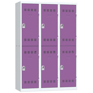 Meervaks garderobekast, Type garderobekast: Met vakken, Materiaal: Staal, Aantal vakken/kolom: 2, Aantal kastkolommen: 3, Onderstel: Op sokkel, Breedte kolom: 400 mm, Aantal kubusvakken: 6, Type sluiting: Met hangslot, Hoogte: 1800 mm, Breedte: 1200 mm, Diepte: 500 mm, Plaatstaal dikte: 7/10de, Nuttige hoogte vak: 809 mm, Nuttige breedte vak: 398 mm, Nuttige diepte vak: 473 mm, Kleur ombouw: Lichtgrijs, Kleur deur: Paars, Geleverd gemonteerd: ja, Gerecyclede verpakkingen: 95 %, Gerecycled product: 52 %, Eco-verantwoordelijke aanpak: ja, NF Milieu: nee, NF: nee