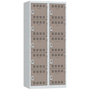 Meervaks garderobekast, Type garderobekast: Met vakken, Materiaal: Staal, Aantal vakken/kolom: 5, Aantal kastkolommen: 2, Onderstel: Op sokkel, Breedte kolom: 400 mm, Aantal kubusvakken: 10, Type sluiting: Met hangslot, Hoogte: 1800 mm, Breedte: 800 mm, Diepte: 500 mm, Plaatstaal dikte: 7/10de, Nuttige hoogte vak: 337 mm, Nuttige breedte vak: 398 mm, Nuttige diepte vak: 473 mm, Kleur ombouw: Lichtgrijs, Kleur deur: Taupe, Geleverd gemonteerd: ja, Gerecyclede verpakkingen: 95 %, Gerecycled product: 52 %, Eco-verantwoordelijke aanpak: ja, NF Milieu: nee, NF: nee