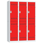 Meervaks garderobekast, Type garderobekast: Met vakken, Materiaal: Staal, Aantal vakken/kolom: 2, Aantal kastkolommen: 3, Onderstel: Op sokkel, Breedte kolom: 400 mm, Aantal kubusvakken: 6, Type sluiting: Met sleutel, Hoogte: 1800 mm, Breedte: 1200 mm, Diepte: 500 mm, Plaatstaal dikte: 7/10de, Nuttige hoogte vak: 809 mm, Nuttige breedte vak: 398 mm, Nuttige diepte vak: 473 mm, Kleur ombouw: Lichtgrijs, Kleur deur: Rood, Geleverd gemonteerd: ja, Gerecyclede verpakkingen: 95 %, Gerecycled product: 52 %, Eco-verantwoordelijke aanpak: ja, NF Milieu: nee, NF: nee