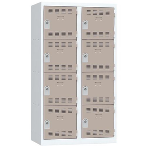 Meervaks garderobekast, Type garderobekast: Met vakken, Materiaal: Staal, Aantal vakken/kolom: 4, Aantal kastkolommen: 2, Onderstel: Op sokkel, Breedte kolom: 400 mm, Aantal kubusvakken: 8, Type sluiting: Met sleutel, Hoogte: 1800 mm, Breedte: 800 mm, Diepte: 500 mm, Plaatstaal dikte: 7/10de, Nuttige hoogte vak: 422 mm, Nuttige breedte vak: 398 mm, Nuttige diepte vak: 473 mm, Kleur ombouw: Lichtgrijs, Kleur deur: Taupe, Geleverd gemonteerd: ja, Gerecyclede verpakkingen: 95 %, Gerecycled product: 52 %, Eco-verantwoordelijke aanpak: ja, NF Milieu: nee, NF: nee