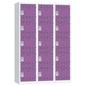 Meervaks garderobekast, Type garderobekast: Met vakken, Materiaal: Staal, Aantal vakken/kolom: 5, Aantal kastkolommen: 3, Onderstel: Op sokkel, Breedte kolom: 400 mm, Aantal kubusvakken: 15, Type sluiting: Met sleutel, Hoogte: 1800 mm, Breedte: 1200 mm, Diepte: 500 mm, Plaatstaal dikte: 7/10de, Nuttige hoogte vak: 337 mm, Nuttige breedte vak: 398 mm, Nuttige diepte vak: 473 mm, Kleur ombouw: Lichtgrijs, Kleur deur: Paars, Geleverd gemonteerd: ja, Gerecyclede verpakkingen: 95 %, Gerecycled product: 52 %, Eco-verantwoordelijke aanpak: ja, NF Milieu: nee, NF: nee