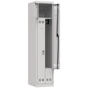 L-vormige, ruimtebesparende garderobekast, Type garderobekast: L-vormige deur, Materiaal: Staal, Aantal vakken/kolom: 2, Aantal kastkolommen: 1, Onderstel: Op sokkel, Breedte kolom: 400 mm, Aantal kubusvakken: 2, Type sluiting: Met sleutel, Hoogte: 1800 mm, Breedte: 400 mm, Diepte: 500 mm, Plaatstaal dikte: 7/10de, Nuttige hoogte vak: 1675 mm, Nuttige breedte vak: 398 mm, Nuttige diepte vak: 473 mm, Kleur ombouw: Lichtgrijs, Kleur deur: Lichtgrijs, Geleverd gemonteerd: ja, Gerecyclede verpakkingen: 95 %, Gerecycled product: 52 %, Eco-verantwoordelijke aanpak: ja, Garderobe breedte: 200 mm, NF Milieu: nee, NF: nee