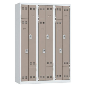 L-vormige, ruimtebesparende garderobekast, Type garderobekast: L-vormige deur, Materiaal: Staal, Aantal vakken/kolom: 2, Aantal kastkolommen: 3, Onderstel: Op sokkel, Breedte kolom: 400 mm, Aantal kubusvakken: 6, Type sluiting: Met hangslot, Hoogte: 1800 mm, Breedte: 1200 mm, Diepte: 500 mm, Plaatstaal dikte: 7/10de, Nuttige hoogte vak: 1675 mm, Nuttige breedte vak: 398 mm, Nuttige diepte vak: 473 mm, Kleur ombouw: Lichtgrijs, Kleur deur: Bruin, Geleverd gemonteerd: ja, Gerecyclede verpakkingen: 95 %, Gerecycled product: 52 %, Eco-verantwoordelijke aanpak: ja, Garderobe breedte: 200 mm, NF Milieu: nee, NF: nee