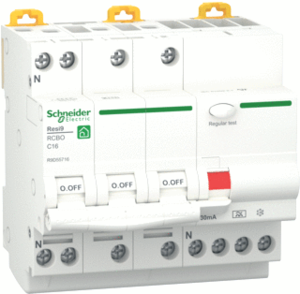 Schneider Electric Resi9 aardlekautomaat, nom. (meet)stroom 16A, uitschakelkarakteristiek C, breedte in module-eenheden 4, 3 beveiligde polen, meeschakelende nul, type lekstroom A, 4 polen (totaal), nom. foutstroom 0.03A, beschermingsgraad (IP) IP20, frequentie 50Hz, inbouwdiepte 43.5mm,