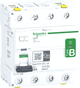 Schneider Electric aardlekschakelaar, 4 polen, type lekstroom B, DIN-rail, nom. (meet)stroom 25A, nom. foutstroom 0.3A, aansluitbare geleiderdoorsnede eend 1 - 35mm², nevenapparaat mogelijk, frequentie 50Hz, beschermingsgraad (IP) IP20, aansluitbare geleiderdoorsnede meer 1 - 25mm²,