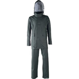 Comfort Collectie Regenkleding (jas + broek). Polyurethaan / PVC met polyester voering. Jas: capuchon opgerold in de kraag. Ritssluiting onder de flap met drukknopen. Twee zijzakken aan de voorzijde. Luchtige rug. Trekkoord in de taille. Broek: drukknopen aan de voorkant. Trekkoord in de taille + elastische band. Verstelbare pijpen met drukknopen. 2 zijsplitten. Gelaste naden die voor waterdichtheid zorgen. Keuze uit: geel of blauw of groen.
