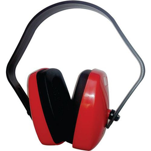 Klassieke koptelefoon Ruisonderdrukkende koptelefoon. Gemaakt van twee rode geluiddempers verbonden door een hoofdband en zwarte oorkussens gevuld met geluidsisolerend schuim.