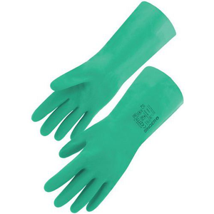 CHEMISCHE BESCHERMING TYPE A-AJKLMNO [Professionele reiniging in een agressieve omgeving] Nitril beschermende handschoenen met katoen vlokvoering. Zonder drager. De handpalm, bedekt met diamantvormig reliƫf, biedt een betrouwbare grip. Lengte 330 mm. (*) Dikte 0,38 mm. (*) (+/- 0,03 mm). Kleur: groen. (*) Gemiddelde waarden
