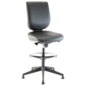 Hoge of zitten-staan werkplaatsstoel met middelhoge rugleuning, in hoogte verstelbaar via tandheugel. Synchroonmechanisme met persoonlijke spanningsregeling en blokkering op verschillende standen. Ergonomische, gebogen zitting met 3 welvingen. Frans fabricaat.