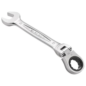 Scharnierende combinatiesleutel met ratel voor eenvoudige toegang tot de moeren op lastige plaatsen. Compact ratelmechanisme, vrijlooprichting omkeerbaar door de sleutel om te draaien. Scharnierende ringkop 180°, steekkop onder een hoek van 15°, terugstelhoek van 5°. Sleutel met verchroomde satijnglansafwerking.