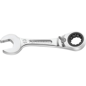 Ratel combinatiesleutels met extra korte handgrepen: ideaal voor gebruik in drukke ruimtes. Compact, omkeerbaar hefboom-bediend ratelmechanisme. 5° terugloophoek (6° voor maten 7 en 8 mm). Oog en vork schuin onder een hoek van 15°. Metrische afmetingen: van 7 tot 19 mm. Presentatie: satijnchroom.