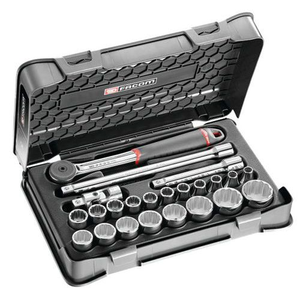 Bevat: 1 x 1/2 waterdichte ratel met hoge prestaties: S. 161B. 19 x 1/2 12-kant metrische doppen: S. 8 - 9 - 10 - 11 - 12 - 13 - 14 - 15 - 16 - 17 - 18 - 19 - 21 - 22 - 23 - 24 - 27 - 30 - 32 mm 2 x 1/2 verlengstukken: L 130 mm (S. 210) - L 250 mm (S. 215). 1 x 1/2 cardanas: S. 240A. Wordt geleverd met een pictogramblad om uw doos te personaliseren. Lege doos: BP. MBOXM. Thermogevormd blad M (309 x 188 mm): PL. M01. Gewicht: 3,600 kg.