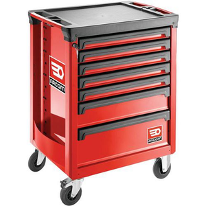 Gereedschapswagen met 7 laden voor maximaal 18 modules.Groot werkblad 560x460mm in vezelgevuld polypropyleen, bestand tegen stoten en koolwaterstoffen en een statische belasting van 800 kg.2 geïntegre